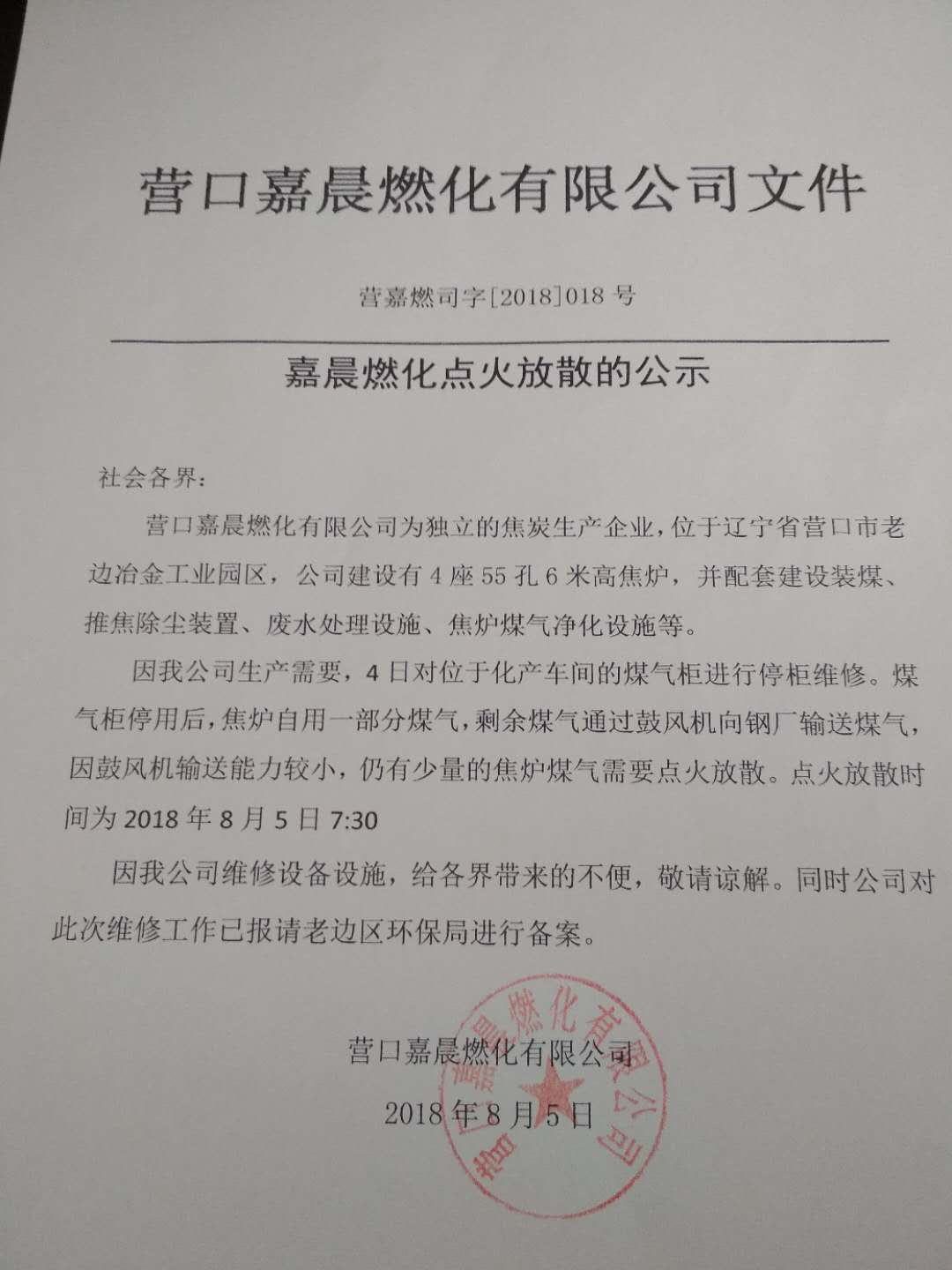 嘉晨燃化點(diǎn)火放散的公示
